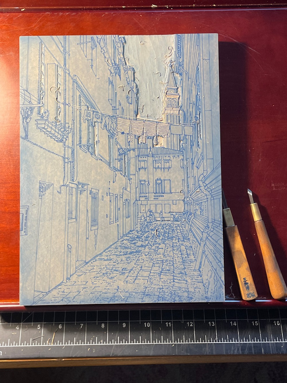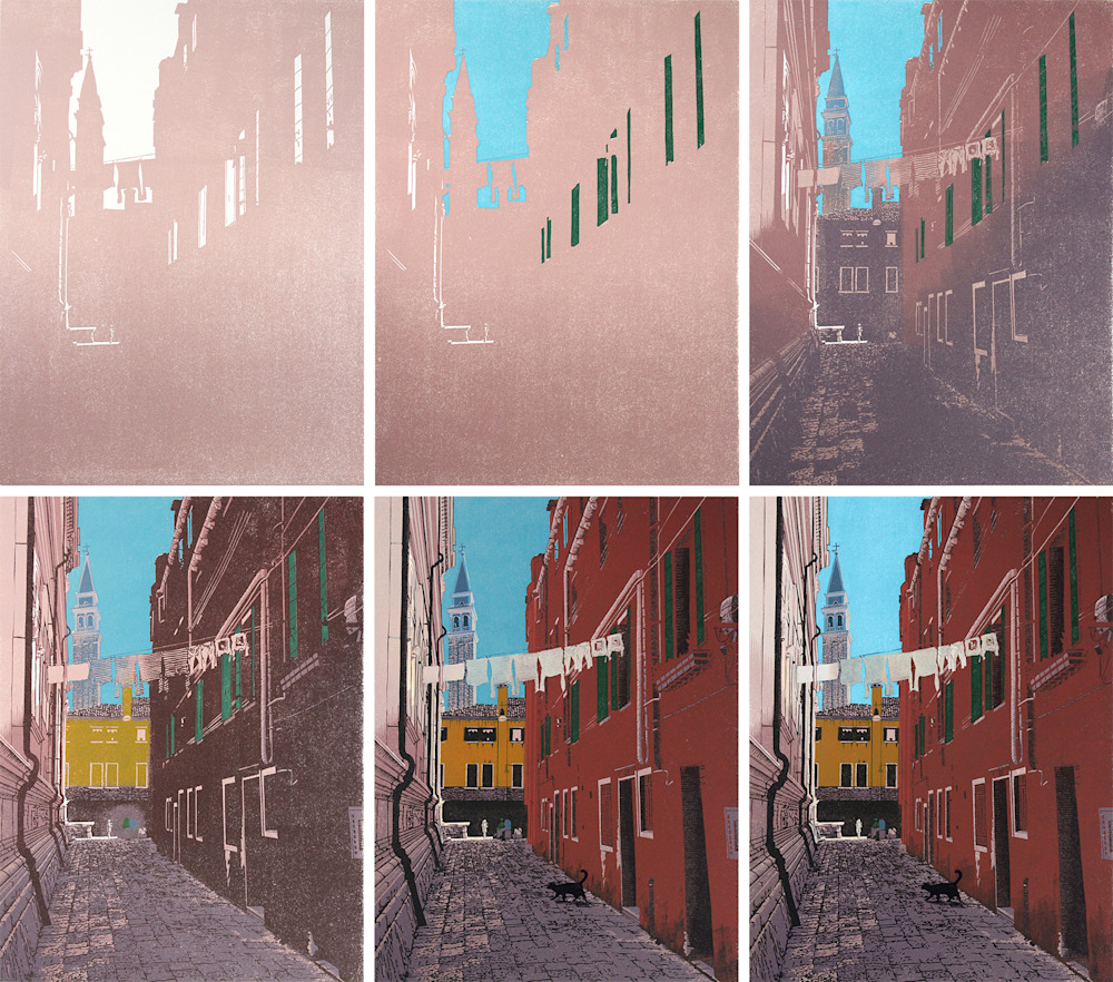 Above is one of three linoleum blocks being carved to make the print. This composition is a bit of a composite of several photographs I took. Laundry day appears to be on Sundays and I loved the inclusion of a line of drying clothes that included the Gondolieri striped shirts (which don't really appear in the print until the final impression). As always, the print evolved over the course of multiple impressions. Here are the impressions used to compile the image.